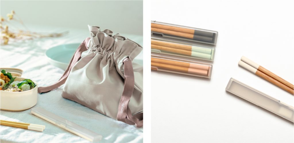 オプションとして、500ml・650ml兼用のオリジナル巾着袋や、コンパクトなスリムタイプのお箸セットも合わせてお使いください。